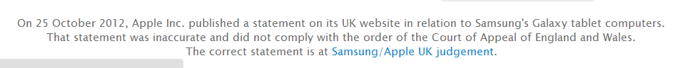 To some this is a win for Apple; however, since Apple decided to wage war on the technological world they have been feeling their own fair share of karma lately. The California company was just ordered to pay $368 million in damages [Source:PCMag] over FaceTime patents to VirnetX; the patent in question involves using DNS to setup a VPN. In addition, there are more cases that they have been losing around the world, one of which forced them to place an apology on their website. In fact, their first attempt had a snide remark in it so they were forced to re-post, seen below: